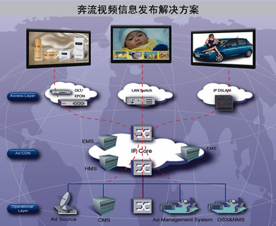 UT斯達(dá)康緊跟市場(chǎng)發(fā)展趨勢(shì)和運(yùn)營(yíng)商步伐,深入研究戶外液晶廣告業(yè)務(wù)的發(fā)展、大力推進(jìn)廣告平臺(tái)的研發(fā)。2006年,UT斯達(dá)康推出了奔流(RollingStream)視頻信息發(fā)布解決方案(如圖2所示)。奔流視頻信息發(fā)布解決方案是以奔流(RollingStream)IPTV平臺(tái)為基礎(chǔ),結(jié)合戶外液晶廣告市場(chǎng)需求,融合運(yùn)營(yíng)商以視頻為主的綜合信息發(fā)布的需求,真正運(yùn)營(yíng)級(jí)的電信級(jí)解決方案。該方案可以幫助運(yùn)營(yíng)商實(shí)現(xiàn)融合信息服務(wù)和廣告業(yè)務(wù)的統(tǒng)一運(yùn)營(yíng),幫助運(yùn)營(yíng)商開展兼具公益性和盈利性的信息發(fā)布業(yè)務(wù),運(yùn)營(yíng)商在推進(jìn)社會(huì)信息化、造福公眾的同時(shí),通過視頻廣告的運(yùn)營(yíng),也能獲取盈利。該方案基于電信級(jí)平臺(tái)的穩(wěn)定性、安全性、擴(kuò)展性設(shè)計(jì)要求,可支持百萬(wàn)級(jí)大規(guī)模部署能力,可提供電信級(jí)質(zhì)量保證的服務(wù);該方案基于IP流媒體技術(shù),可通過IP網(wǎng)絡(luò)實(shí)時(shí)、精準(zhǔn)、互動(dòng)地投放廣告內(nèi)容,從而可以支持豐富、新穎的廣告運(yùn)營(yíng)模式;該方案基于數(shù)字多媒體技術(shù),除了可以發(fā)布視頻廣告,還可以發(fā)布圖片、文字、消息等廣告內(nèi)容。