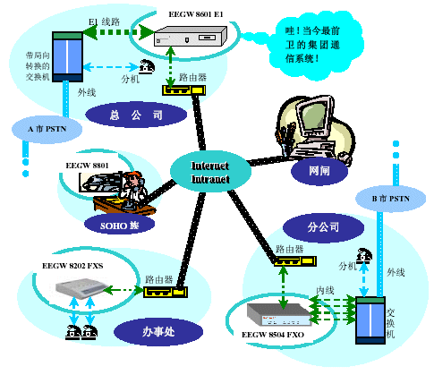 - 在IP網內建立智能交換中心完成兩個異質網PSTN網和數據網在本地異地的集成