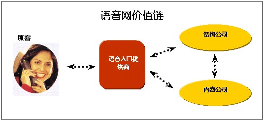 結(jié)構(gòu)公司-技術(shù)軟件提供商(語(yǔ)音識(shí)別、位置標(biāo)識(shí))、主機(jī)公司和服務(wù)站、網(wǎng)絡(luò)發(fā)展商(網(wǎng)絡(luò)應(yīng)用程序服務(wù)器、網(wǎng)絡(luò)整合工具)、軟件和平臺(tái)提供商和躉售網(wǎng)絡(luò)傳輸提供商。這些公司將與語(yǔ)音入口提供商建立公司對(duì)公司的關(guān)系。