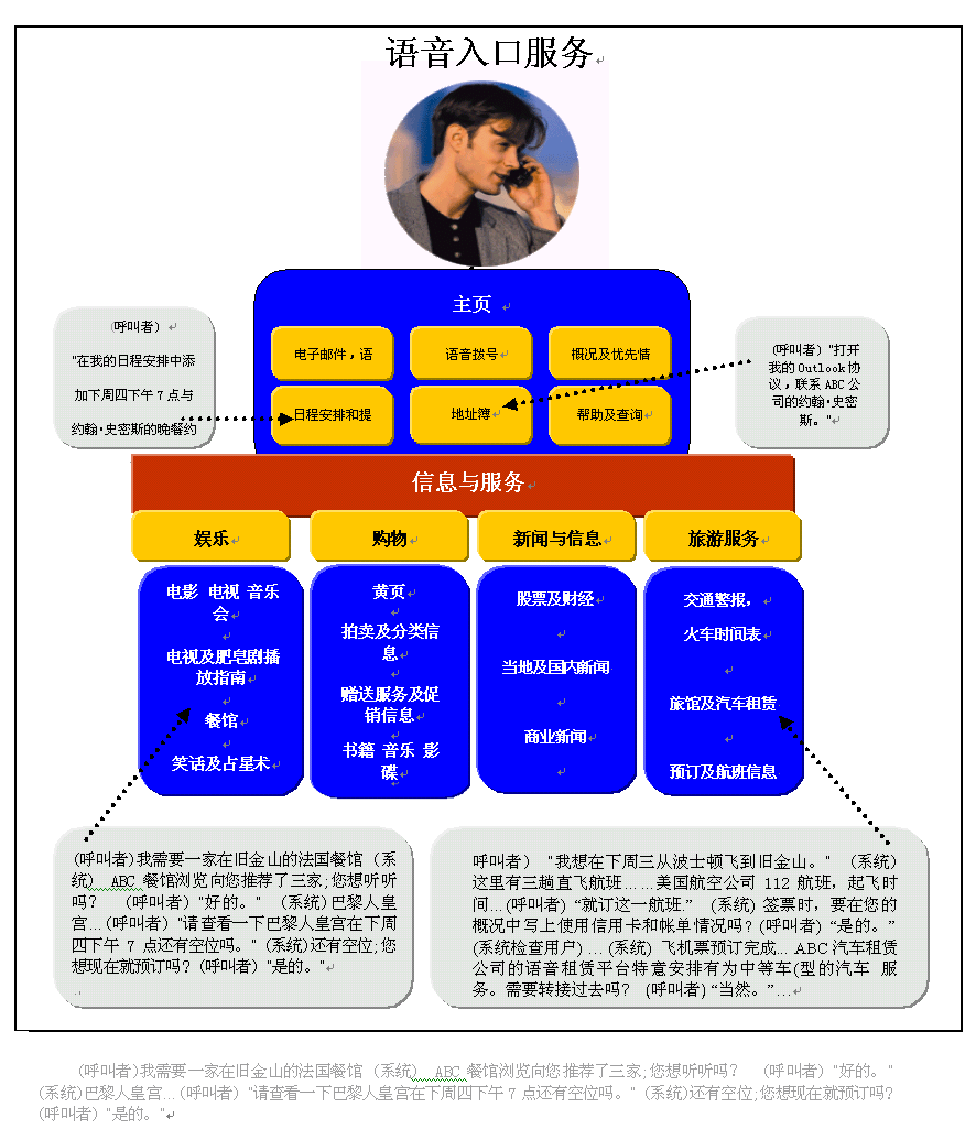 語(yǔ)音網(wǎng)最吸引人之處就在于它可以在一次通話中,同時(shí)處理多個(gè)任務(wù)。下圖表明一名商務(wù)人員是如何安排好與一個(gè)未來的商務(wù)旅行有關(guān)的一系列任務(wù)的。他獲取了對(duì)自己有用的信息,順利達(dá)成了一項(xiàng)語(yǔ)音商務(wù)交易,接收個(gè)人信息和辦公室的幫助,并撥打電話所有這些都是在一個(gè)同步過程中完成的。