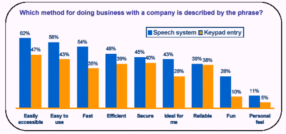 此外,十個(gè)人中九個(gè)人認(rèn)為他們從使用語(yǔ)音服務(wù)中得到了在鍵盤式服務(wù)中得不到的價(jià)值不菲的好處,并有70%的人說(shuō)如果語(yǔ)音服務(wù)系統(tǒng)取代了按鍵式系統(tǒng)的話,他們的效率也將得以提高。