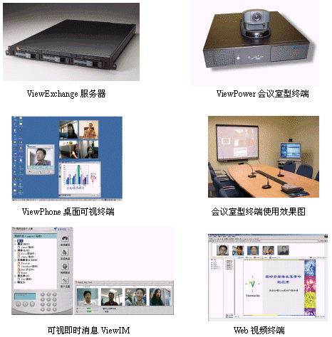 如下圖所示,ViewOffice由會議室型終端ViewPower,客戶端軟件ViewPhone,客戶端即時(shí)消息軟件ViewIM,多點(diǎn)控制服務(wù)器ViewExchange