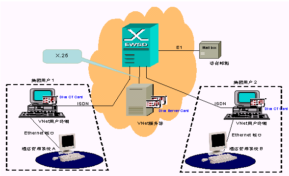 圖中集團(tuán)用戶1與集團(tuán)用戶2內(nèi)部使用了配置Eicon 公司Diva CT Card的Vnet系統(tǒng)用戶終端,同時(shí)接入ISDN設(shè)備與EWSD交換機(jī)連接,信號通過EWSD交換機(jī)響應(yīng)給配置Eicon