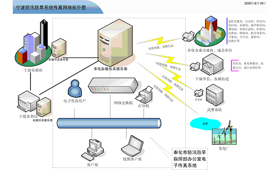 如拓樸圖所標,寧波市政府、寧波水利局與奉化市三防辦均采用了加拿大Eicon 公司與拓敏聯(lián)合推出的傳真服務器系統(tǒng),可進行針對需求的智能設(shè)定傳真發(fā)送。