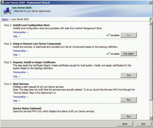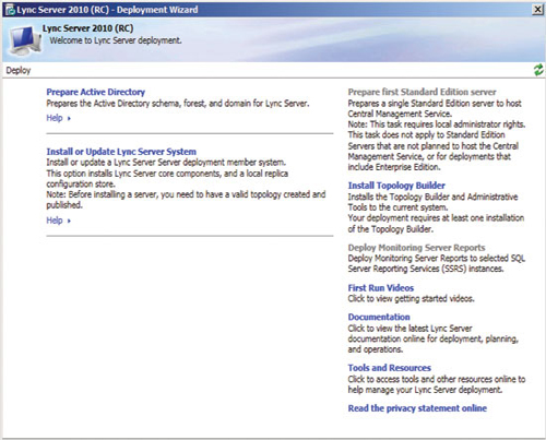 準(zhǔn)備好基礎(chǔ)結(jié)構(gòu)并發(fā)布拓?fù)浜螅纯砷_始安裝前端服務(wù)器和服務(wù)器角色,以啟用 A/V 會議、企業(yè)語音、監(jiān)控、存檔及其他功能。準(zhǔn)備每臺服務(wù)器從運(yùn)行部署向?qū)В▍⒁妶D 3)開始,但每個服務(wù)器角色都有自己的安裝和配置要求。您可以在 TechNet 庫的“部署 Lync Server 2010 Standard Edition”部分查找更多詳細(xì)信息。
