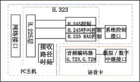 用語音卡來搭建IP超市的核心在于如何用語音卡來搭建一個(gè)VoIP的語音網(wǎng)關(guān)。由于增加了VoIP功能,與傳統(tǒng)的CTI集成相比較,用語音卡來搭建一個(gè)VoIP的語音網(wǎng)關(guān),更富有挑戰(zhàn)性:語音卡除需要實(shí)現(xiàn)原有的模擬或數(shù)字電路接口外,還需要實(shí)現(xiàn)語音壓縮的編解碼、語音在IP網(wǎng)的傳輸協(xié)議以及解決好由此而產(chǎn)生的如回聲消除、靜音抑制、去時(shí)延抖動(dòng)、QoS控制等問題。語音編碼標(biāo)準(zhǔn)一般要支持G.729、G.723等,目前國內(nèi)絕大多數(shù)VoIP網(wǎng)絡(luò)采用H.323協(xié)議棧,從兼容性考慮,用語音卡搭建的VoIP語音網(wǎng)關(guān)也應(yīng)采用H.323協(xié)議。其結(jié)構(gòu)如圖1所示。