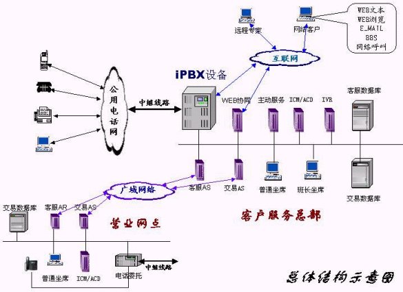 在總部設(shè)立集中的客戶服務(wù)中心完成對(duì)全網(wǎng)的人工座席的管理和調(diào)度,由總部的ACD完成對(duì)全網(wǎng)人工業(yè)務(wù)的呼叫分配,借助廣域網(wǎng)絡(luò),實(shí)現(xiàn)話務(wù)在區(qū)域范圍內(nèi)的接續(xù)。在座席配置上既可以采用集中配置,各營(yíng)業(yè)部分散配置專(zhuān)家座席的方式。