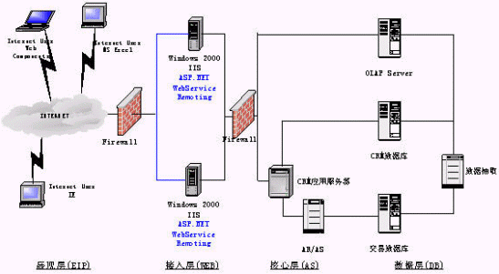 展現(xiàn)層實(shí)現(xiàn)定制化的、支持各種接入設(shè)備的統(tǒng)一消息平臺(tái)是非常必要的,它必將極大地促進(jìn)公司服務(wù)產(chǎn)品的發(fā)展。在展現(xiàn)層我們還強(qiáng)調(diào)企業(yè)信息門戶的建立:信息不是孤立的,需要一個(gè)統(tǒng)一的、互動(dòng)的、個(gè)性化的、全面的綜合表現(xiàn)形式,以更方便公司人員對信息的獲取,作出正確的決策。使用ASP.Net和OfficeXP Web Components OLAP展示工具,并能有機(jī)的與辦公自動(dòng)化工具結(jié)合起來。