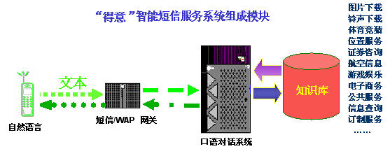 "得意"智能短信系統(tǒng)是在現(xiàn)有的數(shù)據(jù)通信和短信服務(wù)的技術(shù)平臺(tái)上,加入基于中文語言理解技術(shù)的"得意"口語對(duì)話系統(tǒng),從而能夠讓用戶在手機(jī)上以自然語言的形式享受指定領(lǐng)域的智能短信服務(wù)。智能短信系統(tǒng)對(duì)短信文本進(jìn)行自動(dòng)分析和理解,再?gòu)闹R(shí)庫(kù)中提取用戶所需的信息,然后自動(dòng)產(chǎn)生智能應(yīng)答語句,并以短信文本的形式發(fā)回用戶。由于"得意"口語對(duì)話系統(tǒng)具有上下文相關(guān)理解和人機(jī)混合主導(dǎo)等強(qiáng)大功能,在規(guī)定的領(lǐng)域內(nèi),用戶可通過一個(gè)或者多個(gè)短信構(gòu)成一組對(duì)話,完成復(fù)雜的信息查詢或者其他互動(dòng)服務(wù)。