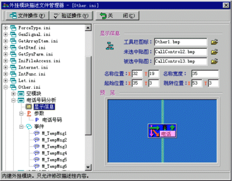 CTI Builder提供了全面開放的控件設(shè)計接口,也就是說用戶可以根據(jù)自己的特殊需要添加各種各樣的模塊到CTI Builder中。所以即使是非常特殊的需要,用戶也可以通過添加控件來解決。其實CTI Builder中大部分的功能模塊也是通過這個開放的控件設(shè)計接口設(shè)計的。下圖就是用戶自定義模塊的設(shè)計界面: