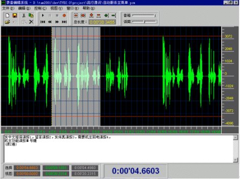 。。PCM Editor中提供了對語音的剪輯、拷貝、粘貼、混音、特效、漸變、幅度縮放等功能。下圖為PCM Editor的運行界面: