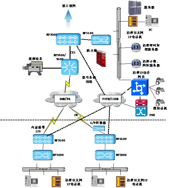 目前許多公安系統(tǒng)雖然采用具有IP語音功能的路由設(shè)備組建網(wǎng)絡,但在業(yè)務語音交流通常還通過PBX集團交換機走電信PSTN/ISDN電話網(wǎng),這樣無法節(jié)省電話費用,反而增加了辦公費用。邁普IP語音解決方案采用了邁普MyPower VG2000IP語音網(wǎng)關(guān)和邁普以太網(wǎng)IP電話進行改造。在整個網(wǎng)點語音終端全部設(shè)備選用經(jīng)濟型邁普以太網(wǎng)IP電話機,它采用雙以太口設(shè)計,使網(wǎng)絡無需重新布線,同時也可使用已有的路由器上IP語音模塊;邁普以太網(wǎng)IP電話機之間的話音通信通過邁普呼叫管理服務器集中控制。在主體IP網(wǎng)絡中,邁普IP語音網(wǎng)關(guān)放置于中心機房作為傳統(tǒng)PSTN的出口,可以通過VOS接口、E1接口(中國一號信令)、E&M接口等多種方式接入公安PBX,將PSTN線路傳來的時分話音或傳真信息進行分組和壓縮,轉(zhuǎn)換成IP數(shù)據(jù)包,通過路由設(shè)備路由到目的地;在沒有PBX的公安機房,邁普IP語音網(wǎng)關(guān)可以提供32路的模擬用戶接口,可以完全替代傳統(tǒng)PBX并接入PSTN,并提供額外功能,如圖中虛線所示;整個方案還可以針對公安用戶特殊需求"定做"特色功能,例如緊急告警等方便日常辦公。