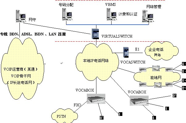 本方案中,企業(yè)電話網(wǎng)絡或者駐地網(wǎng)客戶的電話網(wǎng)絡作為大客戶通過IP方式或者通過VOCASWITH的E1端口接入到本地電話接入網(wǎng)絡。安裝VIRTUALSWITCH網(wǎng)關代理系統(tǒng),它作為整個本地電話接入網(wǎng)絡的網(wǎng)守(GATEKEEPER),以集中方式管理域內的所有網(wǎng)關(VOCA-BOX)。