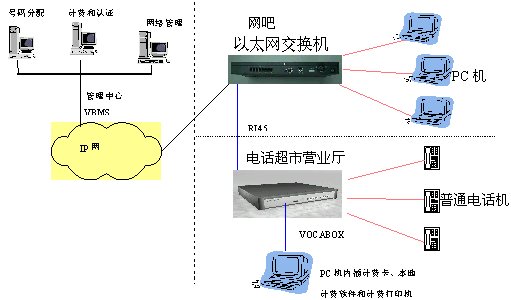 此方案的特點是將電話終端深入到公用電話的超市,用戶可以撥打IP長途電話、PSTN普通電話用戶及移動電話用戶,并在用戶端通過VOCA-BOX語音網(wǎng)關、計費卡和計費軟件實現(xiàn)本地營業(yè)廳立即計費的要求。在運營商的管理中心通過配置VBMS系統(tǒng)實現(xiàn)后臺集中計費認證功能,用于管理各個營業(yè)中心的VOCA-BOX語音網(wǎng)關,各營業(yè)中心的VOCA-BOX語音網(wǎng)關提供認證計費信息給VBMS,計費類型可按實際的需求配置如:預付費、后付費等。此方案可以擴大ISP及寬帶網(wǎng)絡運營商的業(yè)務市場,增加ISP及寬帶網(wǎng)絡運營商的收益。