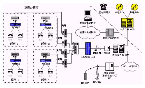 用戶端使用帶4~8個模擬端口的VOCABOX實現(xiàn)語音接入IP數(shù)據(jù)網(wǎng)。在局端采用的是聯(lián)通交換局中大量部署的華為C&C08 交換機的E1數(shù)字中繼接口資源與VOCASWITCH對接,并利用光端機加網(wǎng)橋連接聯(lián)通已有的光纖,實現(xiàn)聯(lián)通IP超市接入聯(lián)通電話網(wǎng)絡。