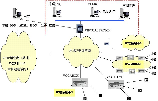 本方案中,各個超市的電話網(wǎng)絡通過IP方式接入到本地電話接入網(wǎng)絡。安裝VIRTUALSWITCH網(wǎng)關代理系統(tǒng),它作為整個本地電話接入網(wǎng)絡的網(wǎng)守(GATEKEEPER),以集中方式管理域內的所有網(wǎng)關(VOCA-BOX)。
