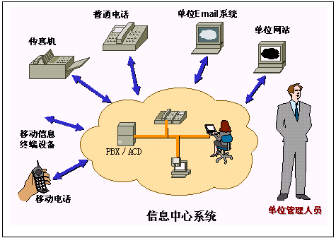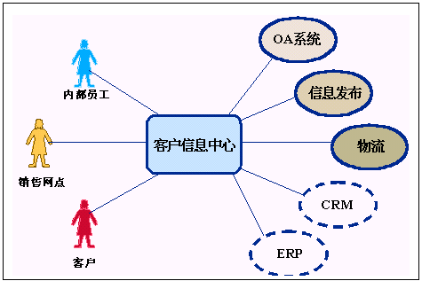 客戶信息中心有兩個層次的含義,首先它是一個信息中心,它應(yīng)該可以訪問到后臺現(xiàn)有的各種系統(tǒng),如OA系統(tǒng)、信息發(fā)布系統(tǒng)、物流系統(tǒng),同時它還應(yīng)該有良好的擴展性,可以和未來的其它系統(tǒng)相銜接,比如CRM系統(tǒng)、ERP系統(tǒng)相接;其次它是一個圍繞客戶的信息中心,它應(yīng)該為客戶提供方便的信息交流手段,這就要求我們能夠通過多種媒介實現(xiàn)信息交互。