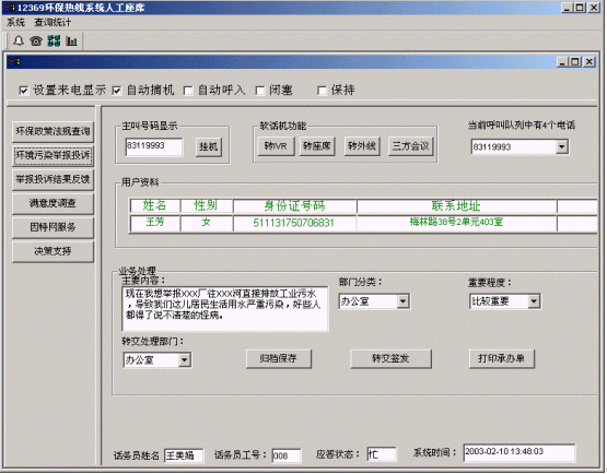該系統(tǒng)利用環(huán)保局現(xiàn)有的信息網(wǎng)絡資源,將自動語音查詢、人工服務、信息資料處理緊密結合起來,為人民群眾提供全天候24小時不間斷的優(yōu)質服務。