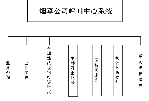 卷煙經(jīng)銷戶等客戶利用電話、傳真、電子郵件、因特網(wǎng)、手機(jī)、短消息等撥打統(tǒng)一的特服號(hào)碼(如800XXX或9XXXX)進(jìn)入煙草公司呼叫中心,本系統(tǒng)依托煙草公司各類業(yè)務(wù)技術(shù)支持系統(tǒng)和網(wǎng)絡(luò)系統(tǒng),實(shí)現(xiàn)煙草專賣局原有管理系統(tǒng)/業(yè)務(wù)系統(tǒng)及數(shù)據(jù)庫(kù)的無(wú)縫連接,通過(guò)人工受理或自動(dòng)語(yǔ)音服務(wù)等方式全天24小時(shí)不間斷地為客戶提供各種服務(wù)。