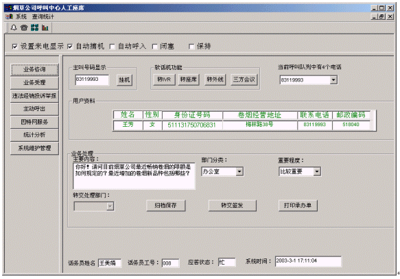 煙草公司呼叫中心將接入功能、導(dǎo)航功能、自動(dòng)語(yǔ)音查詢功能、人工座席服務(wù)功能、話路轉(zhuǎn)接功能、信息資料處理緊密聯(lián)系起來(lái)。用戶撥打特服電話號(hào)碼后,可以根據(jù)需要選擇人工服務(wù)、自動(dòng)語(yǔ)音查詢、自動(dòng)留言,并能夠在幾種服務(wù)中來(lái)回切換或轉(zhuǎn)接其它電話;所記錄的資料可以分門別類的進(jìn)行統(tǒng)計(jì)并形成報(bào)表,供相關(guān)部門進(jìn)行檢索查閱;意見(jiàn)處理完畢,可由座席主動(dòng)呼叫用戶,告知處理意見(jiàn),形成閉環(huán)處理流程。
