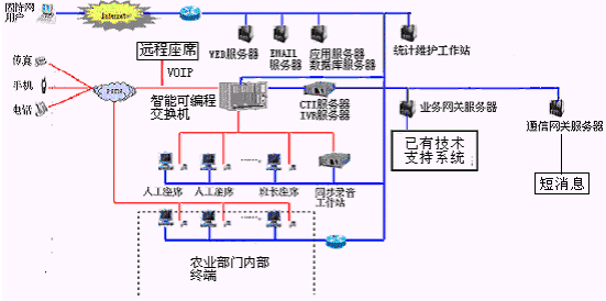 客戶利用電話、傳真、手機等撥打統(tǒng)一的特服號碼(如800XXX或9XXXX)或因特網(wǎng)進入農(nóng)業(yè)分布式呼叫中心,本系統(tǒng)依托農(nóng)業(yè)部門各類計算機業(yè)務技術支持系統(tǒng)和網(wǎng)絡系統(tǒng),實現(xiàn)與農(nóng)業(yè)部門原有管理系統(tǒng)/業(yè)務系統(tǒng)及數(shù)據(jù)庫的無縫連接,通過人工受理或自動語音服務等方式全天24小時不間斷地為客戶提供各種服務。