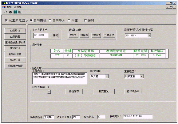 客戶打入電話后,當系統(tǒng)的自動語音應答子系統(tǒng)無法解決客戶問題時,客戶可選擇人工服務,由客戶服務代表直接接聽客戶電話,處理并解決客戶問題。此時客戶同座席話務人員直接溝通,并同時記錄下該客戶的聯(lián)系方式,將相關數(shù)據(jù)添加入系統(tǒng)數(shù)據(jù)庫;也可以在數(shù)據(jù)庫的支持下處理傳真業(yè)務,電子郵件,計算機文件傳輸、滿意度調查等。