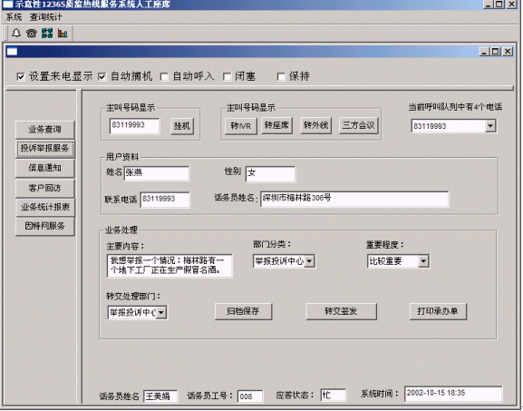 12365質(zhì)監(jiān)熱線服務(wù)系統(tǒng)將接入功能、導(dǎo)航功能、交互式語音應(yīng)答服務(wù)功能、人工座席服務(wù)功能、話路轉(zhuǎn)接功能、信息資料處理緊密聯(lián)系起來。用戶撥打特服電話號碼后,可以根據(jù)需要選擇人工服務(wù)、交互式語音應(yīng)答服務(wù)、自動留言,并能夠在幾種服務(wù)中來回切換或轉(zhuǎn)接其它電話;所記錄的資料可以分門別類的進(jìn)行統(tǒng)計并形成報表,供相關(guān)部門進(jìn)行檢索查閱;意見處理完畢,可由座席主動呼叫用戶,告知處理意見,形成閉環(huán)處理流程。