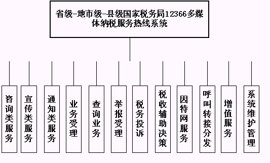 省級國家稅務(wù)局12366多媒體納稅服務(wù)熱線系統(tǒng)的業(yè)務(wù)功能結(jié)構(gòu)如下圖所示: