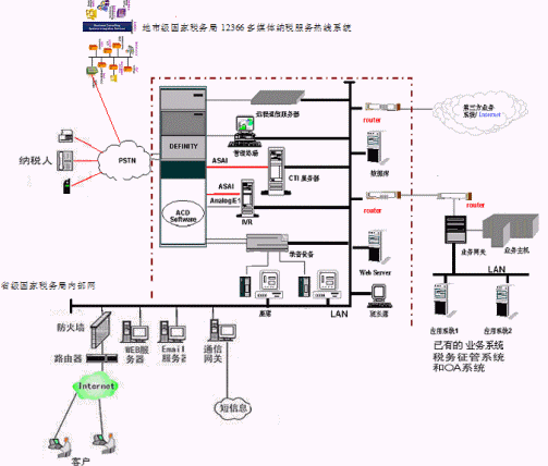 ·系統(tǒng)支持省-市-縣國家稅務(wù)局12366多媒體熱線系統(tǒng)的語音和數(shù)據(jù)聯(lián)網(wǎng); 提供完善的組網(wǎng)方案,實現(xiàn)資源共享,統(tǒng)一提供服務(wù)。