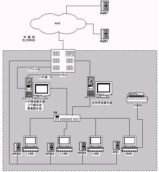 該呼叫中心平臺(tái)網(wǎng)絡(luò)拓?fù)浣Y(jié)構(gòu)如下: