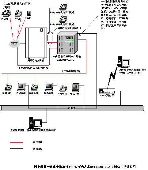 深圳博宇科技一體化交換機(jī)呼叫中心平臺產(chǎn)品BYIPPBX-CC2.0的呼叫中心系統(tǒng)網(wǎng)絡(luò)拓?fù)浣Y(jié)構(gòu)如下: