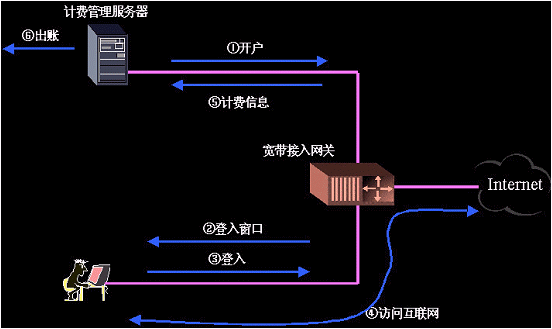 當(dāng)用戶選擇上網(wǎng)后。管理人員首先通過計費(fèi)管理服務(wù)器為用戶開戶。出用戶在打開瀏覽器試圖訪問Internet時會彈來自接入網(wǎng)關(guān)要求登入的窗口。用戶輸入用戶名、密碼并可以選擇適合自己的資費(fèi)方式。輸入信息后接入網(wǎng)關(guān)將信息交由計費(fèi)管理服務(wù)器處理。計費(fèi)管理服務(wù)器驗(yàn)證通過后,向該用戶開放互聯(lián)網(wǎng)出口。在用戶訪問互聯(lián)網(wǎng)的同時,接入網(wǎng)關(guān)計錄下該用戶訪問互聯(lián)網(wǎng)的相關(guān)信息,其中包括訪問的時長和數(shù)據(jù)流量。接入網(wǎng)關(guān)實(shí)時地向計費(fèi)管理服務(wù)器更新用戶的計費(fèi)信息,用戶斷網(wǎng)后計費(fèi)管理服務(wù)器計算用戶上網(wǎng)費(fèi)用。