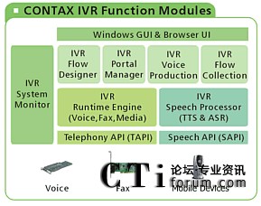 CONTAX IVR 是一個完整的媒體交換方案,可用于交互式語音應答、文字/語音轉換、電腦電話語音整合、傳真轉遞、自動傳真回覆 (FOD)、簡訊發(fā)送等等……