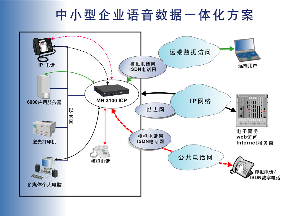 商務電話系統(tǒng)、本地網(wǎng)和網(wǎng)關(guān)集成在統(tǒng)一的平臺上?敏迪網(wǎng)絡推出的MN3100綜合通信平臺就是這樣簡單快捷的滿足您的需要,它是專為小型企業(yè)或大型企業(yè)的分支機構(gòu)而設計的語音數(shù)據(jù)集成的解決方案。