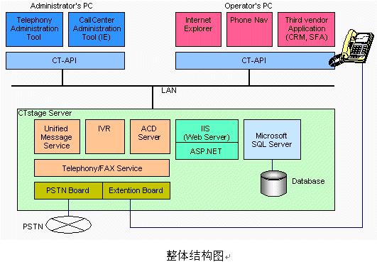 隨著經(jīng)營環(huán)境和企業(yè)環(huán)境的日益激化,作為新時代的信息策略,計算機(jī)電話集成(CTI)也由于投資小效益大而倍受注目。沖電氣公司的CTstage實現(xiàn)最先端的多媒體通信的UnPBX(在服務(wù)器中加插電話板卡,以單臺計算機(jī)實現(xiàn)PBX功能的系統(tǒng))型的開放式CTI系統(tǒng)。在一臺PC服務(wù)器上實現(xiàn)IVR和ACD功能、內(nèi)線電話控制、ACD監(jiān)視器等呼叫中心所需要的功能,成為真正意義上的UnPBX呼叫中心。先進(jìn)的CTI的解決方案將作為企業(yè)的經(jīng)營策略,迅速提高適應(yīng)市場的能力。
