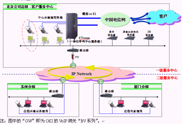 另一方面,OKI則擁有構筑大規(guī)模IP電話的豐富經(jīng)驗,從最初的窄帶網(wǎng)絡到最近的寬帶網(wǎng)絡,OKI一直在提供著最適合使用用戶環(huán)境的、追求音質的VoIP產(chǎn)品。伴隨著寬帶網(wǎng)絡在企業(yè)市場中日益深入的運用,及呼叫中心市場中呈現(xiàn)的最新需求,OKI充分將IP技術運用到呼叫中心系統(tǒng)中,推出IP型分散客服中心解決方案。所謂分散型系統(tǒng),是指用網(wǎng)絡將分散在各個點的多個呼叫中心連接起來,作為一個大規(guī)模中心統(tǒng)一運用的系統(tǒng)。