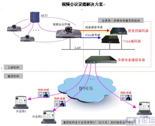 如圖所示,上級(jí)機(jī)構(gòu)視音頻編碼器接在視音頻源上,對(duì)視音頻信號(hào)采集,VGA編碼器采集VGA信號(hào),通過網(wǎng)絡(luò)傳給放在機(jī)房的多媒體錄播服務(wù)器;鶎訖C(jī)構(gòu)的各個(gè)分會(huì)場(chǎng)通過IE瀏覽器的方式接受會(huì)議直播。
