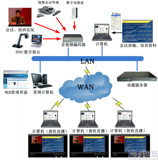 如上圖所示,會易錄采用前后臺分離模式,前臺設(shè)備(視音頻編碼器、數(shù)據(jù)編碼器)負責(zé)信號采集;后臺設(shè)備(多媒體錄播服務(wù)器)負責(zé)信號處理。前后臺設(shè)備之間通過IP網(wǎng)絡(luò)進行通訊。上述編碼器可將采集到的視音頻信號和計算機屏幕信號編碼后通過網(wǎng)絡(luò)發(fā)送到后臺的多媒體錄播服務(wù)器,多媒體錄播服務(wù)器可將收到的視音頻信號和計算機屏幕信號進行同步一體化的錄制、直播、點播。
