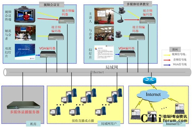 銳取多媒體錄播系統(tǒng)采用了分布式的架構(gòu),前端的視音頻編碼器負(fù)責(zé)視音頻信號的采集,后臺的多媒體錄播服務(wù)器負(fù)責(zé)信號的錄制、直播和點播。多媒體錄播系統(tǒng)可從視頻會議終端上獲取信號,并將視頻會議實時直播到?jīng)]有視頻會議終端覆蓋的分行,擴(kuò)大了視頻會議的參與范圍,讓更多的員工可以參加遠(yuǎn)程培訓(xùn)。