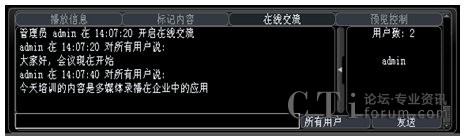 系統(tǒng)增加了多方文字互動交流功能,在線交流功能可以選擇給所有人員發(fā)送消息,也可以選擇給某一特定人員發(fā)送。這樣在會議或培訓(xùn)的過程中,管理員可以選擇性的提出相應(yīng)的問題給相關(guān)人員,考核相關(guān)人員的培訓(xùn)效果;其他人員也可以將會議或培訓(xùn)過程中遇到的疑問、難點及時的反應(yīng)給管理員進(jìn)行解答,增強(qiáng)會議或培訓(xùn)的成效。