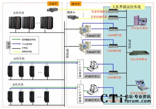 如上圖所示,該機(jī)房分為設(shè)備間和操作間,小型機(jī)等主機(jī)系統(tǒng)安裝在設(shè)備間內(nèi),平時(shí)工作人員通常在操作間內(nèi)通過(guò)Telnet終端及KVM控制臺(tái)等方式訪問(wèn)主機(jī)系統(tǒng)進(jìn)行操作,這些Telnet終端、KVM控制臺(tái)即為機(jī)房?jī)?nèi)人與機(jī)器打交道的“人機(jī)界面”。