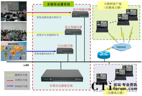 廣州市旅游職業(yè)學校多媒體錄播系統(tǒng)組網(wǎng)如上圖所示。在本項目中編碼器和多媒體錄播服務(wù)器分別部署在教室和機房內(nèi),前端的視音頻編碼器采集老師、學生的視音頻信號,VGA編碼器采集PPT內(nèi)容,編碼器采集信號并編碼后通過網(wǎng)絡(luò)發(fā)送給多媒體錄播服務(wù)器,多媒體錄播服務(wù)器接收并實現(xiàn)同步錄制、直播及事后點播。老師、學生可在教室、辦公室、宿舍等任何可以連接校園網(wǎng)的地方實時觀看教室內(nèi)進行的課程,可滿足日常多媒體教學、課件錄制、微格教學等應(yīng)用的需要。