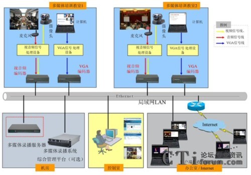 如上圖所示,銳取多媒體錄播成功實(shí)現(xiàn)了中國(guó)電力投資集團(tuán)高級(jí)培訓(xùn)中心兩間多媒體教室內(nèi)培訓(xùn)課程的錄制、直播和后期點(diǎn)播。銳取多媒體錄播前端的編碼器部署在多媒體教室,編碼器采集培訓(xùn)的PPT和老師講課的圖像聲音編碼后通過(guò)網(wǎng)絡(luò)傳送給機(jī)房的多媒體錄播服務(wù)器,多媒體錄播服務(wù)器實(shí)現(xiàn)培訓(xùn)過(guò)程中“教師學(xué)生圖像聲音+老師講稿(PPT)”的同步錄制、直播、點(diǎn)播。