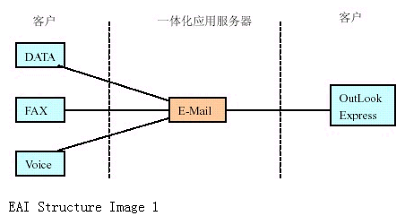 如果我們把各種信息(電話、傳真、數(shù)據(jù))在一體化應(yīng)用服務(wù)器上統(tǒng)一為E-Mail 形式在企業(yè)內(nèi)部或INTERNET 郵件系統(tǒng)轉(zhuǎn)發(fā)。實現(xiàn)起來就較簡單,如下圖所示: