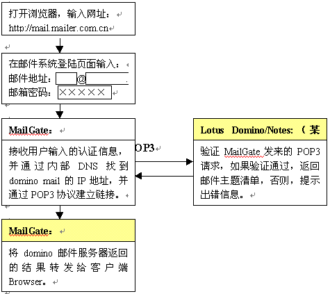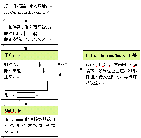 金笛郵件網(wǎng)關(guān)完全基于B/S架構(gòu)的設(shè)計,使得郵件收發(fā)、管理都是基于瀏覽器完成,客戶端只要打開IE瀏覽器即可,無需做任何設(shè)置,大大方便了用戶。也就是說,在城域網(wǎng)任一節(jié)點,都可以通過內(nèi)部域名(DNS)訪問郵件網(wǎng)關(guān),然后通過郵件網(wǎng)關(guān)與用戶所在的domino郵件服務(wù)器通訊,將郵件主題、郵件內(nèi)容顯示在web頁面上。金笛?郵件網(wǎng)關(guān)的具體工作流程如下: