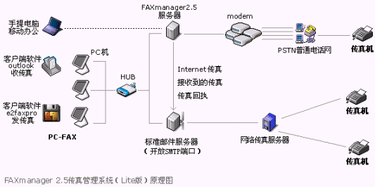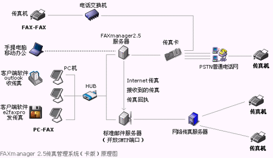 FAXmanager 2.5傳真管理系統(tǒng)安裝在局域網(wǎng)的一臺專用服務器上,運行環(huán)境可以是:Windows98/NT/2000/XP等,此服務器可以同郵件服務器為同一臺機器,構成企業(yè)郵件/傳真專用服務器,F(xiàn)AXmanager 2.5可以和企業(yè)郵件系統(tǒng)或群件系統(tǒng)整合使用,可以是Unix/Linux環(huán)境的Qmail和Sendmail等郵件系統(tǒng),也可以是Microsoft Exchange和Lotus Domino/Notes等群件系統(tǒng),當然也可以是IComMail等企業(yè)郵件系統(tǒng),也支持虛擬主機設置企業(yè)郵局開設POP3帳戶和上網(wǎng)代理服務器的使用環(huán)境。