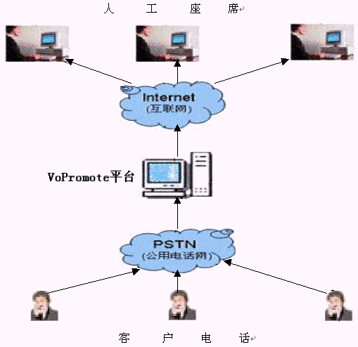 VoPromote語(yǔ)音平臺(tái)是基于W3C組織制定的VoiceXML標(biāo)準(zhǔn)開發(fā)的語(yǔ)音平臺(tái)。它對(duì)各個(gè)功能模塊的實(shí)現(xiàn)技術(shù)要求低且與國(guó)際標(biāo)準(zhǔn)兼容,在此基礎(chǔ)上再添VOIP功能更是如虎添翼。其VOIP工作模式圖如下: