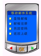 進(jìn)入移動(dòng)郵件系統(tǒng)后,可分別選擇"登陸郵箱、郵箱注冊(cè)、找回密碼、返回上級(jí)"來進(jìn)行下一步操作。