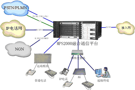 MPS2000融合通信平臺(tái)組網(wǎng)能力強(qiáng)大,能夠提供數(shù)字中繼、模擬中繼(包括環(huán)路中繼、二/四線中繼等各種模擬中繼)、IP中繼等硬件接口,在信令協(xié)議上支持NO.7、NO.1、Pri等信令以及H.323、SIP、MGCP等協(xié)議。平臺(tái)能夠與數(shù)字網(wǎng)、模擬網(wǎng)、數(shù);旌途W(wǎng)、IP電話網(wǎng)、NGN(下一代網(wǎng)絡(luò))等現(xiàn)有的各種網(wǎng)絡(luò)進(jìn)行組網(wǎng)。