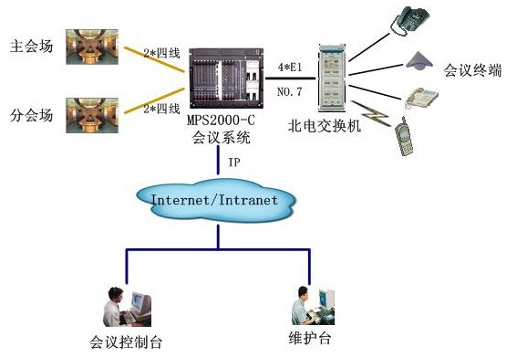 該會(huì)議系統(tǒng)通過4個(gè)數(shù)字中繼,與北電用戶交換機(jī)互連,采用PRI信令。與視頻會(huì)議系統(tǒng)主會(huì)場采用四線音頻接口接主會(huì)場調(diào)音臺(tái),保證與視頻會(huì)議系統(tǒng)音頻的無縫對接。通過以太網(wǎng)口與局域網(wǎng)連接,實(shí)現(xiàn)維護(hù)管理及會(huì)議控制等功能。